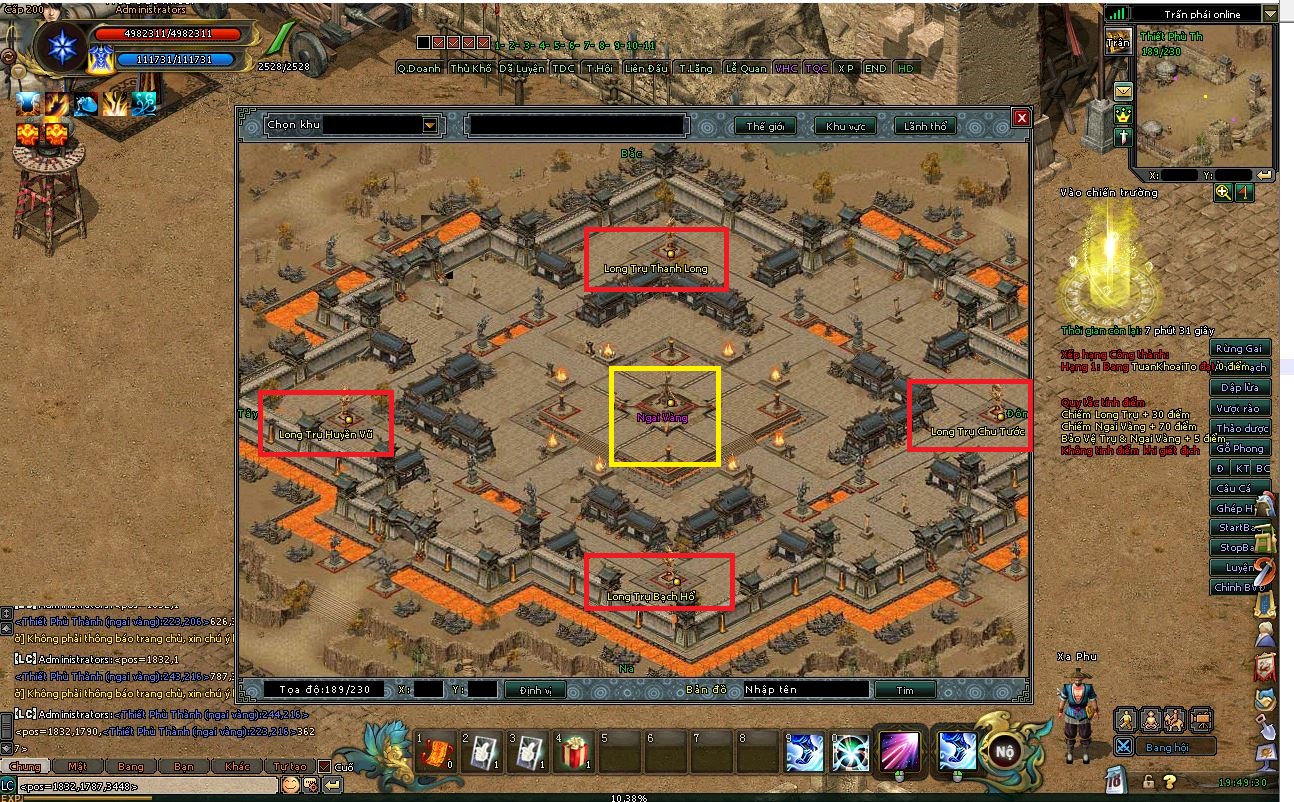 Vào lúc 20h00 , 4 Long Trụ sẽ xuất hiện ở 4 góc, và Long Mạch ở trung tâm của bản đổ Công Thành Chiến